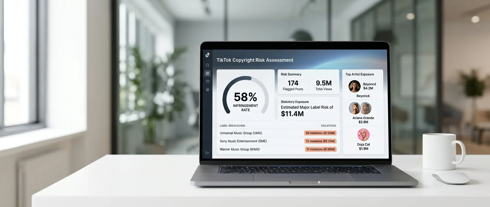 After signing up, we run our software across your social profiles, typically Tik Tok/Instagram/Facebook. We will highlight all the potential copyright infringements. All this data and information is collected into an in depth spreadsheet. You can then act to delete, archive or change the music to commercial license. You can also use the info to discuss with your legal counsel.